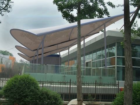 除了一般雨蓬不可比擬的實用、耐用、遮風擋雨的功能外,膜結構雨蓬更是一座雕塑,一件藝術品,給人美的視覺享受。其柔美,其曲線,其剛柔并濟,其豐富造型,其潔白無瑕,讓人眼前一亮,回味悠長。